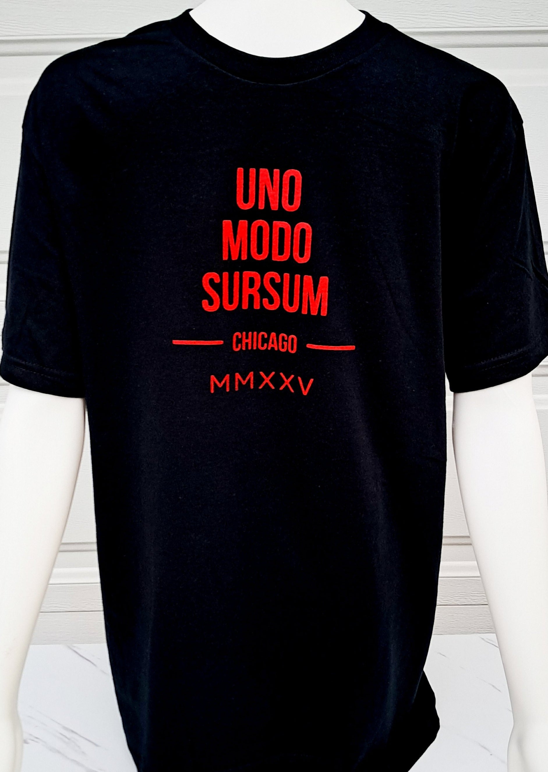 Featuring the UNO MODO SURSUM brand printed on the front, along with our home city and the year of advent in Roman Numerals, 2025. Available in red or black print on a white tee, or red on a black tee.